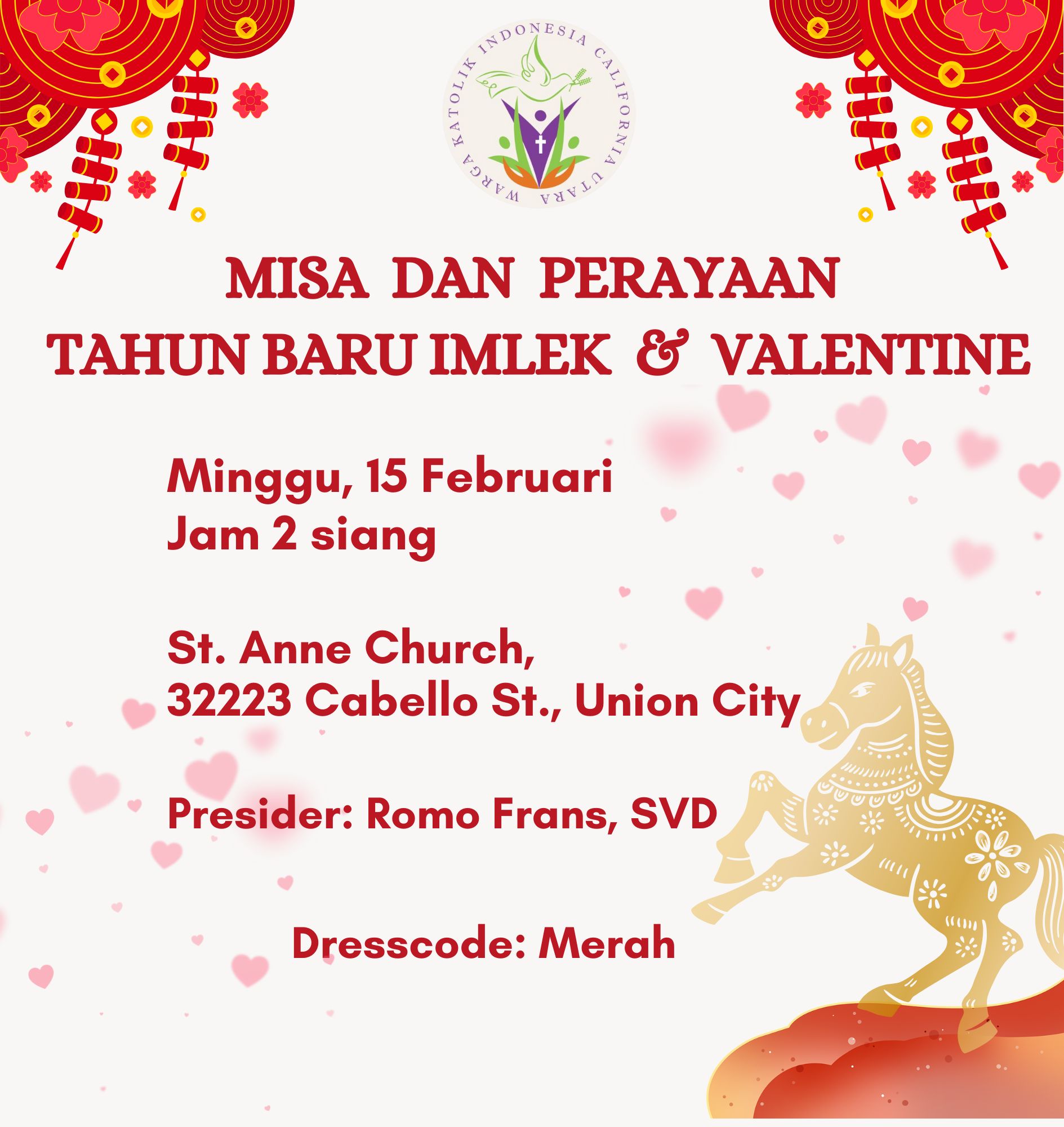 15 Februari - Jam 2:00 siang St. Anne Church 32223 Cabello Street Union City, CA 94587