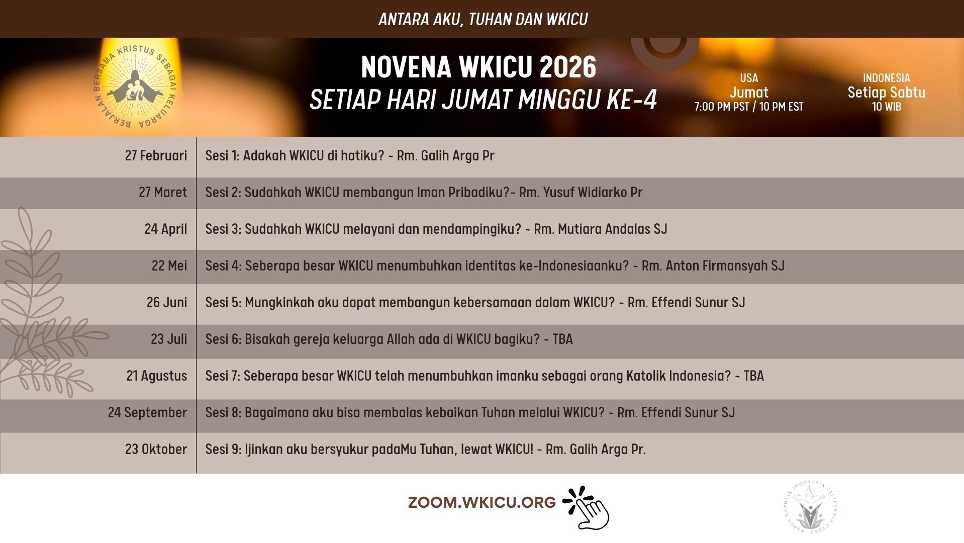 Untuk mengikuti acara ini, join zoom.wkicu.org setiap Jumat minggu ke-4 pukul 7 malam.